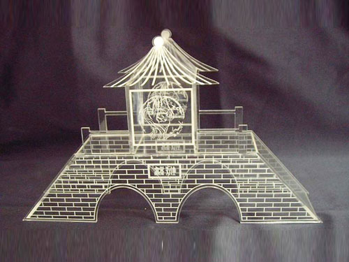 热压法有机玻璃:将有机玻璃薄板加热后,在模具中中热压型。这种造型法制成的工艺品具有形体丰满,曲线流畅,立体感强的特点,有浮雕的效果。热压模可用木材、油泥塑形,然后用铸铅、石膏材料作阴阳模,有机玻璃加热后即可压成型。